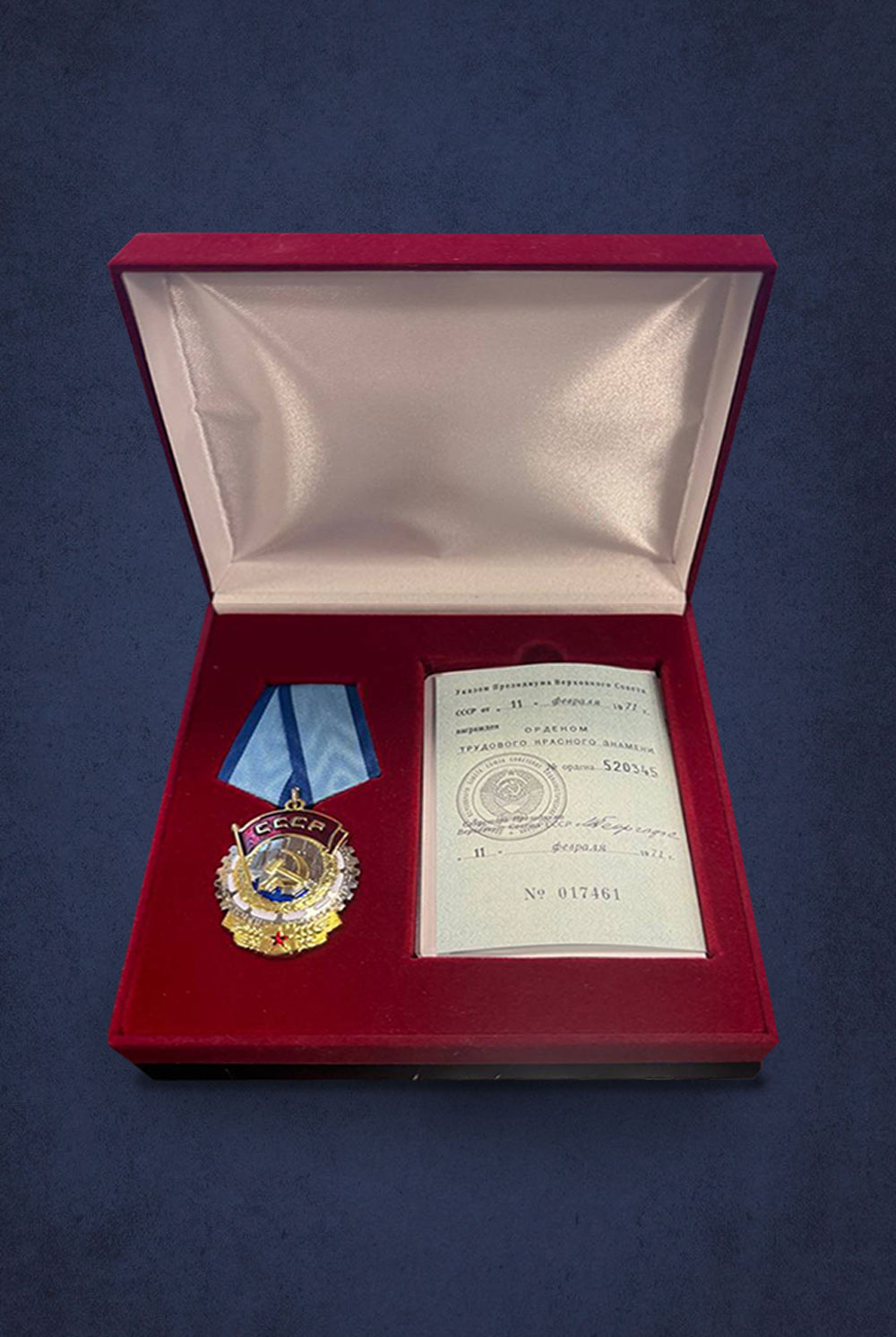 The Order of the Red Banner of Labour was a civilian award of the USSR given for labour achievements. It was established by a Resolution of the Central Executive Committee and the Council of People's Commissars of the USSR on September 7, 1928, to reward great labour merits before the Soviet state and society in production, science, culture, literature, art, public education, healthcare, state, public, and other areas of labour activity. On February 11, 1971, the Moscow Institute of Fine Chemical Technology named after M. V. Lomonosov (now RTU MIREA) was awarded the Order of the Red Banner of Labour by a Decree of the Presidium of the Supreme Soviet of the USSR. The award was granted to the institute for its merits in training specialists for the national economy and advancing scientific research.