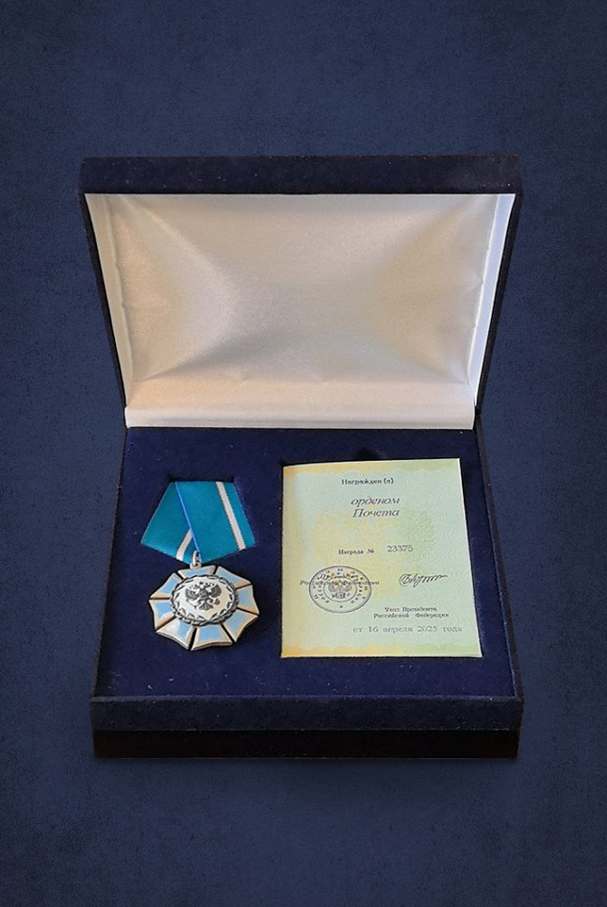 The Order of Honour is a state award of the Russian Federation, established by Presidential Decree No. 442 of March 2, 1994. It is awarded, among other things, for achievements in research activities and for merits in improving the Russian education system. On April 16, 2025, the team of RTU MIREA was awarded the Order for its significant contribution to training highly qualified specialists and many years of diligent work. The decree can be viewed here.